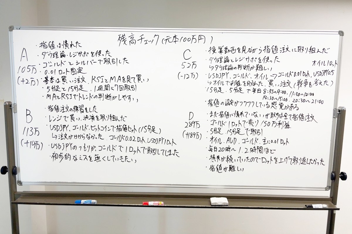 こちらは、個人投資家育成コース受講生の「自宅学習の振り返り記録」です。元本100万円から増えている人もいれば減っている人もいますが、デモ口座を活用しながら、どんな相場でも利益を狙えるように学習を継続しています。