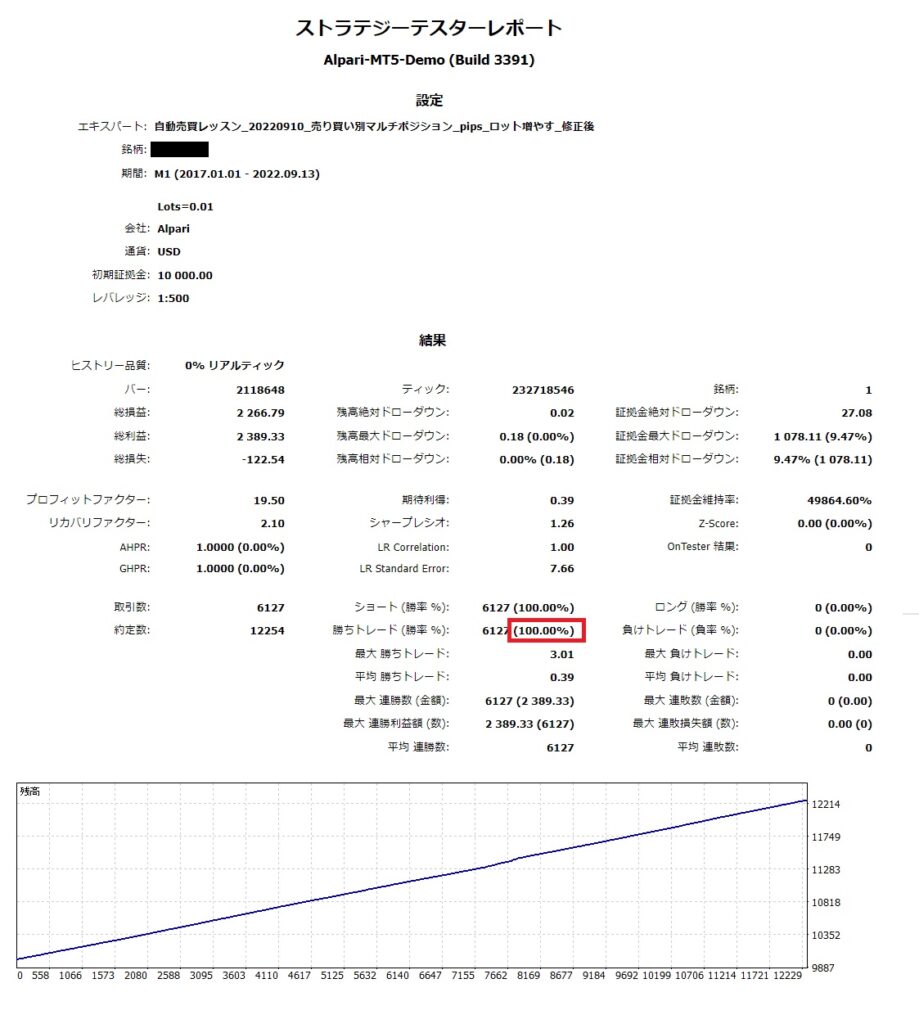 ※やろうと思えばこのように勝率100%、連勝数6127回の自動売買システムを作ることは可能です。ただし、このシステムは実践では使えません。あえて勝率を下げないと投資では資産を増やせない理由があるからです。勝てる投資家は「これは使えない、なぜなら」という説明ができます。投資で大切なことは1回の勝ち負けではなく、「この売買は成功、失敗だった、その理由は、改善策はこれ」など、投資を客観的に理解していることです。