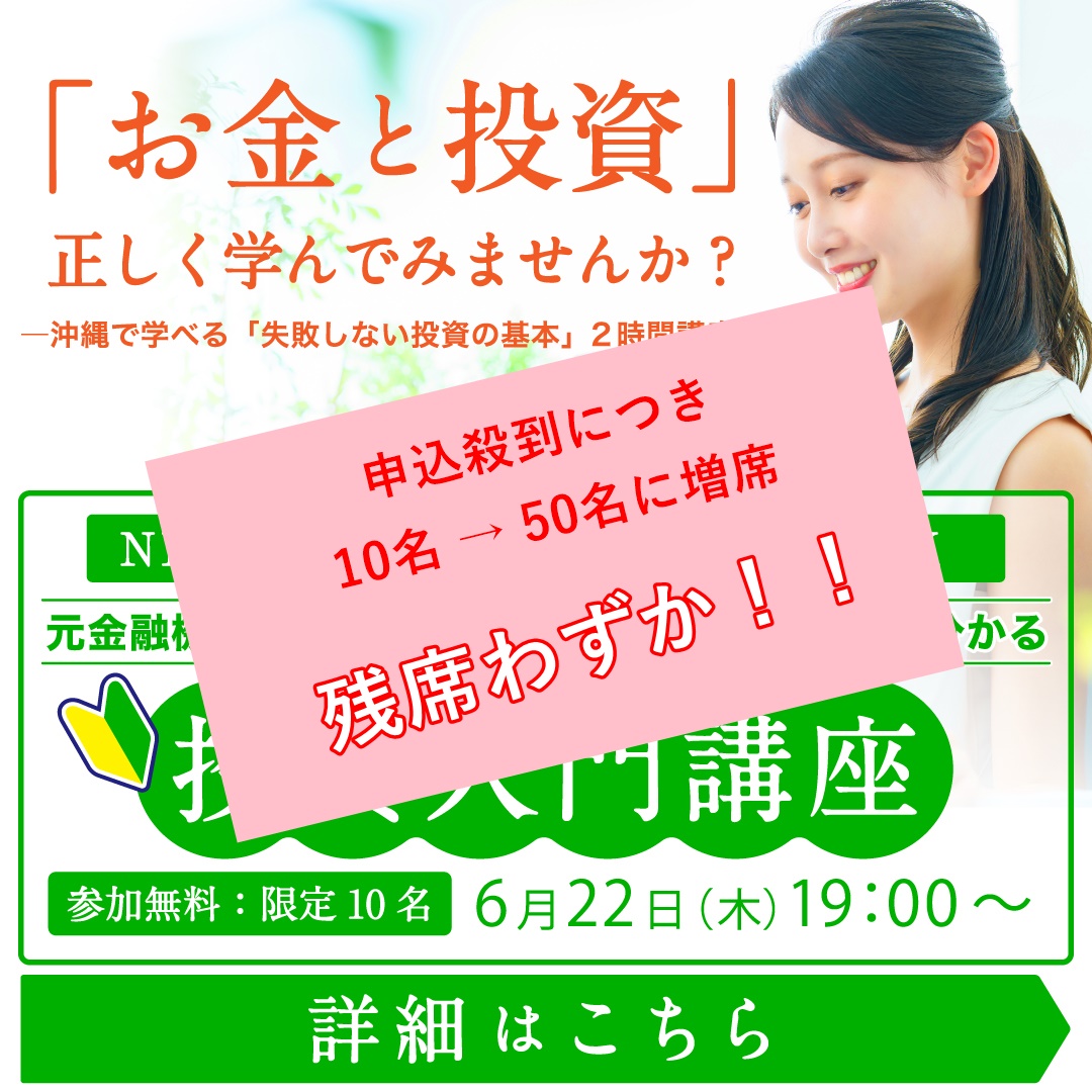6月17日、OTVのテレビ番組『パブピポ』で『投資入門講座』を告知させて頂きました。定員10名のところ約50名に変更したのですが、申込が殺到して残席わずかとなっております。もしかしたらこの記事を読んで頂いてる時点で満席にて受付終了しているかもしれません。