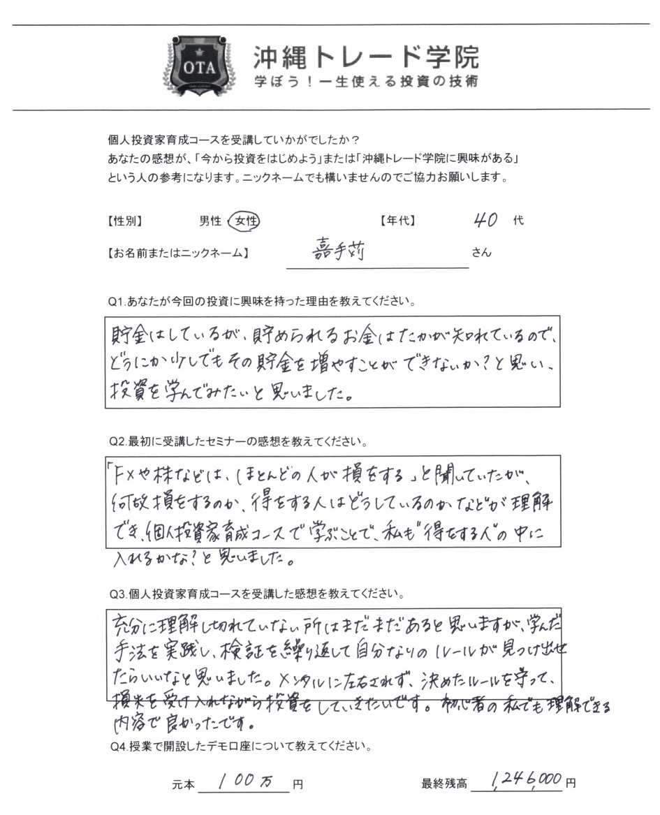 当学院では、過去検証を根拠として相場の原理原則に沿った方法を体系的にお伝えしております。独学では10年経っても分からない事が、最短で約2か月で知る事ができます。参考に受講生の感想を掲載致します。