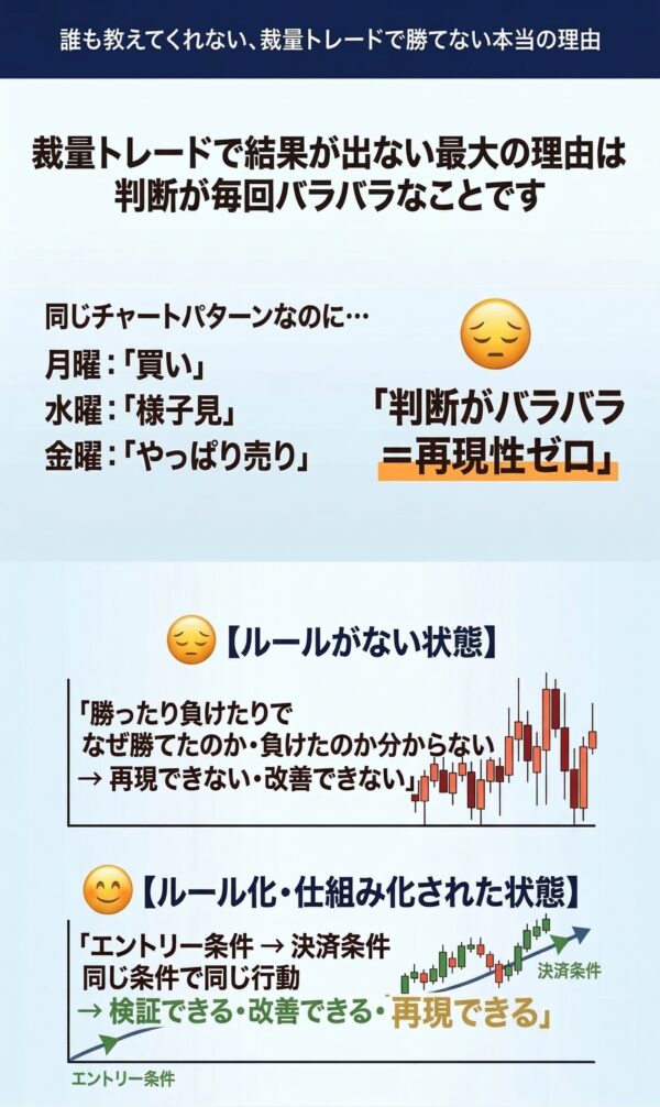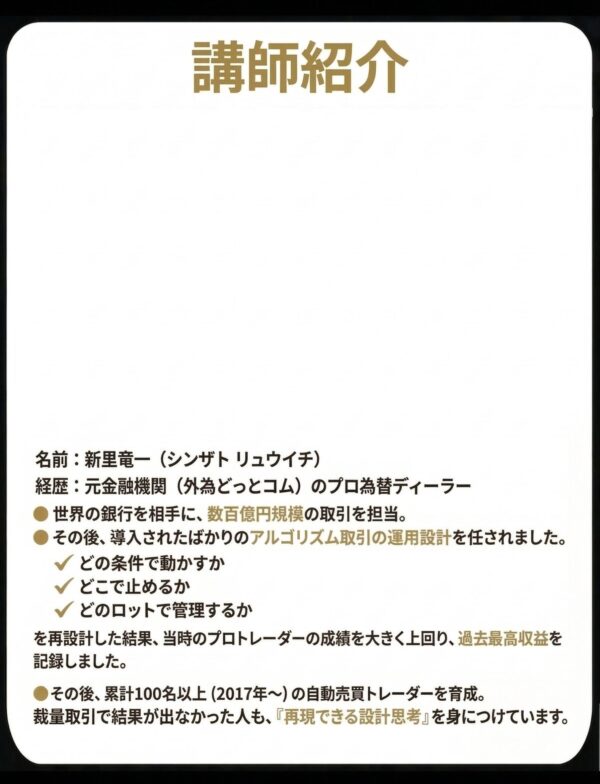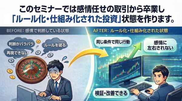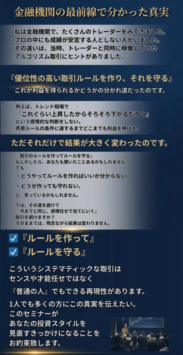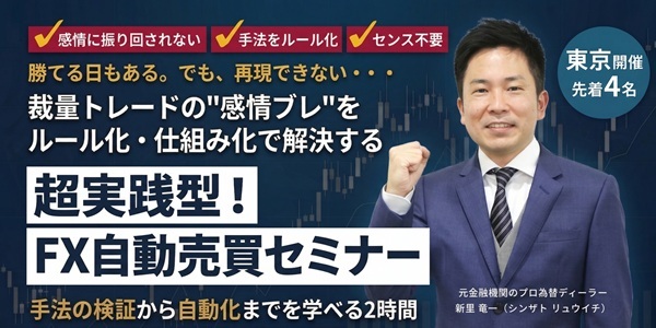 セミナー参加にあたってのお願い (注意事項) | - ・本セミナーは、裁量トレードのルール化・仕組み化・自動化の基礎を学ぶ内容です。裁量FXで結果が安定しない方、感情ブレを解消したい方を対象とし、主旨に賛同いただける方のみお申込みください。